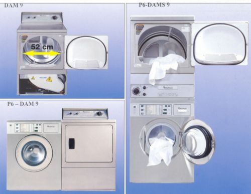 Do przedstawionych wyżej pralnicowirówek P6 i P7 jest możliwe dostawienie suszarki bębnowej DAM 9 lub DAMS 9. Maszyny można ustawić obok siebie lub w celu oszczędności miejsca jedną maszynę można postawić na drugiej.